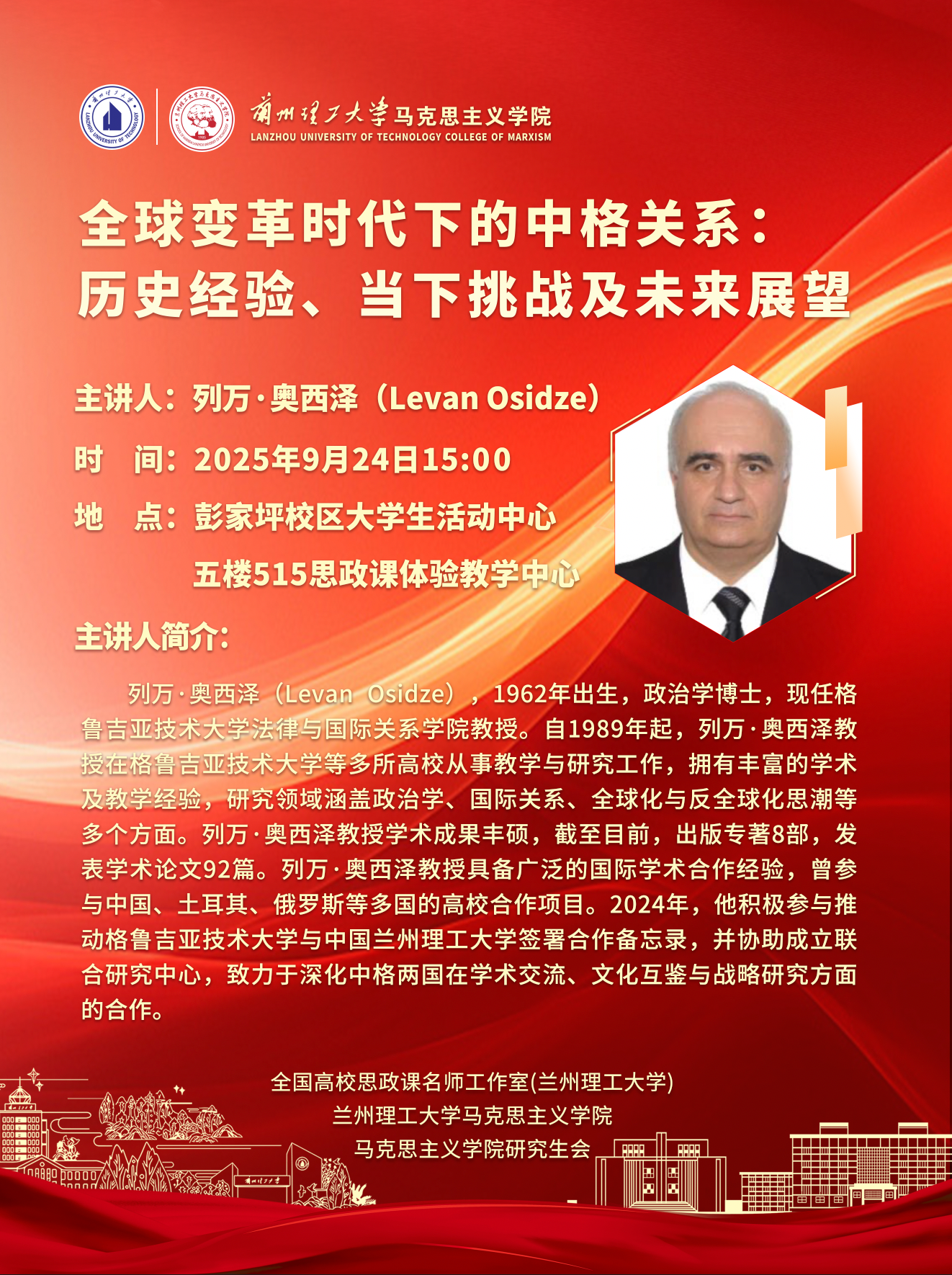 应马克思主义学院邀请,格鲁吉亚技术大学法律与国际关系学院教授列万·奥西泽于9月24日下午为全院师生做学术报告。欢迎各位老师积极参加。